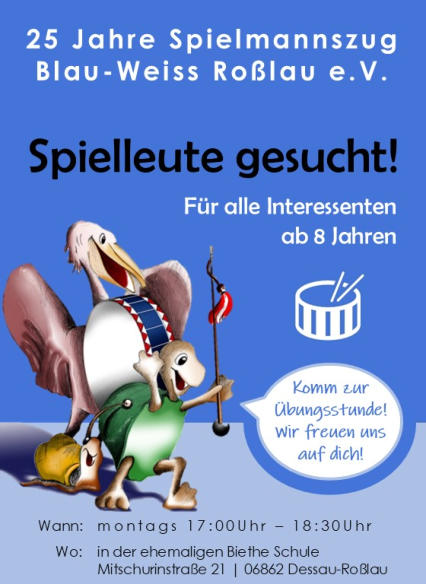 Am 16.04.2024 feiern wir 25 Jahre Spielmannszug Blau-Weiss RoßlauVor 25 Jahren planten Mitglieder des Spielmannszuges des SV Chemie Rodleben einen eigenständigen Verein zu gründen und sich somit aus dem Sportverein Chemie Rodleben herauszulösen.Am 16.04.1999 war es dann soweit. Sieben Mitglieder trafen sich an diesem Tag und gründeten den Spielmannszug Blau-Weiss Roßlau e.V.Erfreulich war, dass viele ehemalige Mitglieder des Spielmannszuges Chemie Rodleben dem neuen Verein beigetreten sind.Zur Vereinsgründung hatte der Verein 75 Mitglieder und bestand aus einem Erwachsenen- und einem Nachwuchsspielmannszug.Der 19.07.2007 war für unseren Verein ein ganz besonderer Tag. Wir erhielten die Schlüssel für unser eigenes Vereinsgebäude. Um es für unsere Zwecke herzurichten, haben wir in ca. 4 Monaten umfangreiche Sanierungs- und Renovierungsarbeiten in unzähligen Arbeitsstunden geleistet. Unterstützung erhielten wir auch von engagierten Sponsoren.Nachdem die wichtigsten Baumaßnahmen abgeschlossen waren, konnten wir bereits am 26.10.2007 unsere erste Übungsstunde in unserem neuen Vereinsheim durchführen.Unser neues Vereinsheim ermöglichte uns abwechlungsreiche Aktivitäten durchzuführen, wie zum Beispiel Spielenachmittage, Lesenächte, Oster- und Weihnachtsbasteln, Weihnachtsfeiern, Halloweenpartys und Grillfeste. Zur Freude unserer jüngsten Mitglieder organisierten wir u.a. Besuche im Dessauer und Ascherslebener Tierpark, im Zoo Leipzig, führten Fahrradtouren durch oder ließen Drachen steigen.Besondere Höhepunkte des Vereinslebens waren in den vergangenen Jahren unsere Wochenendtrainigslager, Besuche im Filmpark Babelsberg und Belantis, Konzertreise nach Vallendar bei Koblenz und das Weinlesefest in Roudnice nad Labem/Tschechien (Partnerstadt von Dessau-Roßlau).In den zurückliegenden 25 Jahren nahmen wir an zahlreichen Musikwettbewerben (Landesmeisterschaften der Spielmannszüge) teil. Dabei können wir auf so manche Erfolge verweisen. Ein erster Erfolg war der Titel als Landespokalsieger des Landesturnverbandes Sachsen-Anhalt im Jahr 2000. Es folgte im Jahr 2001 der 2. Platz im Landespokalwettbewerb. Unser Nachwuchsspielmannszug errang 2003 und 2005 den Vize-Meistertitel der Spielmannszüge im Nachwuchsbereich in Sachsen-Anhalt.Der Erwachsenenspielmannszug belegte 2005 und in den beiden Folgejahren jeweils den 5. Platz der Spielmannszüge in Sachsen-Anhalt. In den Jahren 2010 bis 2013 nahmen wir weiterhin erfolgreich an den Landesmeisterschaften der Spielleute teil.Da WIR, die Roßlauer Spielleute, auch Musik im kleineren Rahmen weiterhin erlebbar machen möchten, ist die Nachwuchsgewinnung von großer Bedeutung.Die Nachwuchsarbeit liegt uns immer sehr am Herzen. Sie gehört zur Sicherung des Fortbestandes unseres Spielmannszuges. Zur Nachwuchsgewinnung stellen wir uns regelmäßig in Schulen unserer Region vor.Wie es im täglichen Leben so ist, gibt es ja häufig persönliche und berufliche Gründe, warum uns Mitglieder nicht mehr aktiv unterstützen können. Es ist jedesmal ein Verlust, ausgebildete, spielfähige Mitglieder ziehen zu lassen.Auch die Zeit der Coraona Pandemie hinterließ deutliche Spuren. Der Spiel- und Übungsbetrieb musste komplett eingestellt werden. Das hat uns auf musikalischer und finazieller Ebene sehr stark belastet, sodass der Gedanke im Raum stand, den Verein aufzulösen. Viele Gespräche und die positive Einstellung der Mitglieder unseres Vereins hat diesen Gedanken jedoch nicht zur Realität werden lassen.Mit großer Energie haben wir massiv Werbung für Nachwuchsmitglieder betrieben. Und dieser Aufwand hat sich für uns gelohnt!Die neugewonnen Mitglieder werden von unseren, auf Lehrgängen ausgebildeten, Übungsleitern wöchentlich unterrichtet.Trotz Höhen und Tiefen, die unser Verein durchlebt hat, werden wir auch in Zukunft alles daran setzen, dass die Spielleutetradition unserer Region Dessau-Roßlau erhalten bleibt.weiter lesen unter Chronik.Mit musikalischen Grüßen, Eure Roßlauer Spielleute.